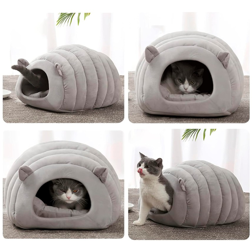 A pesar de su diseño compacto, el interior es amplio y no limita las posiciones de descanso del gato. Puede estirarse, acurrucarse o moverse con libertad dentro de un espacio completamente acolchado. La felpa suave y la almohadilla gruesa ofrecen una sensación de abrigo constante.